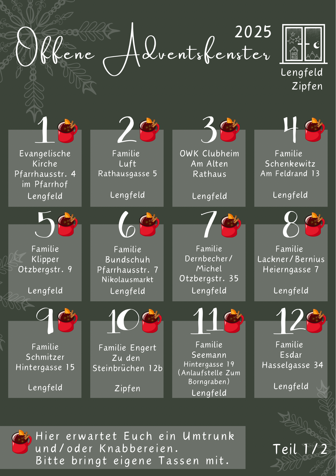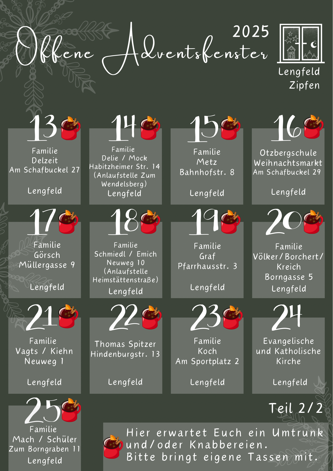 Nach bewährter Tradition werden in Lengfeld und Zipfen, einem Adventskalender entsprechend, täglich vom 01.-24. Dezember vorweihnachtlich geschmückte Fenster in schönem Licht erstrahlen, um von Spaziergängern und Kindern entdeckt und bewundert zu werden. Dieses Jahr war die Nachfrage so groß, dass auch am 25. Dezember ein Fenster leuchten wird 😊.