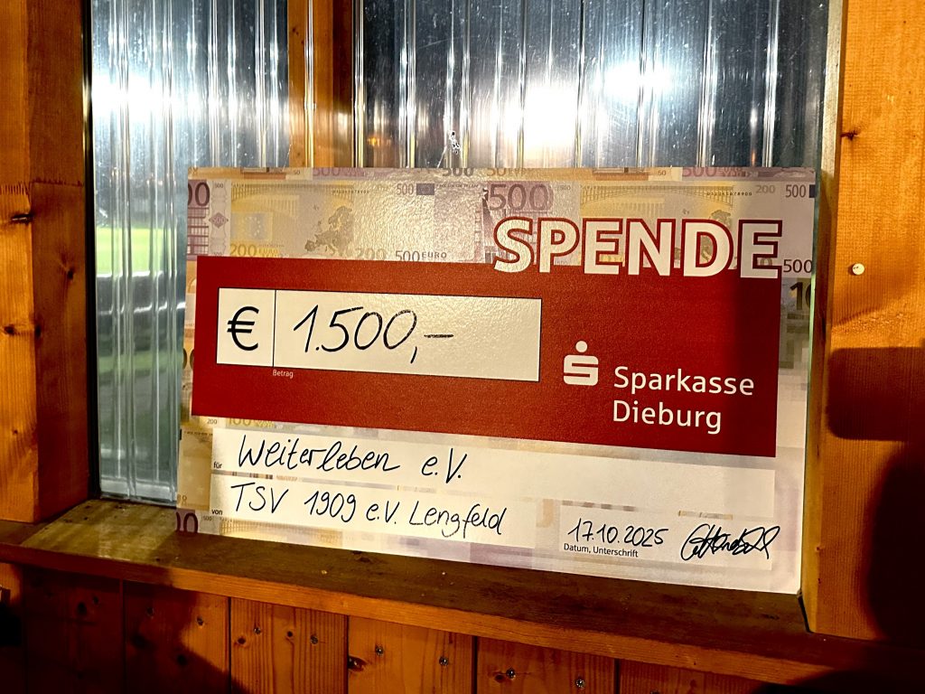 Am Lengfelder Kerbwochenende überreichte der TSV Lengfeld feierlich einen Spendenscheck über 1.500 Euro an den Verein Weiterleben e.V.. Die Spendensumme wurde im Rahmen des Otzberglaufs während der Otzbergwoche gesammelt. Die Startbeiträge der rund 150 teilnehmenden Läuferinnen und Läufer flossen vollständig in den Spendentopf und machten bereits den Großteil des Betrags aus. Um auf einen runden Gesamtbetrag zu kommen, beteiligten sich weitere Gruppen des TSV an der Aktion: Die aktiven Fußballer, der Förderverein des TSV sowie die Alten Herren der SG AH Otzberg steuerten zusätzliche Beiträge bei und machten so die Spendensumme von 1.500 Euro möglich.