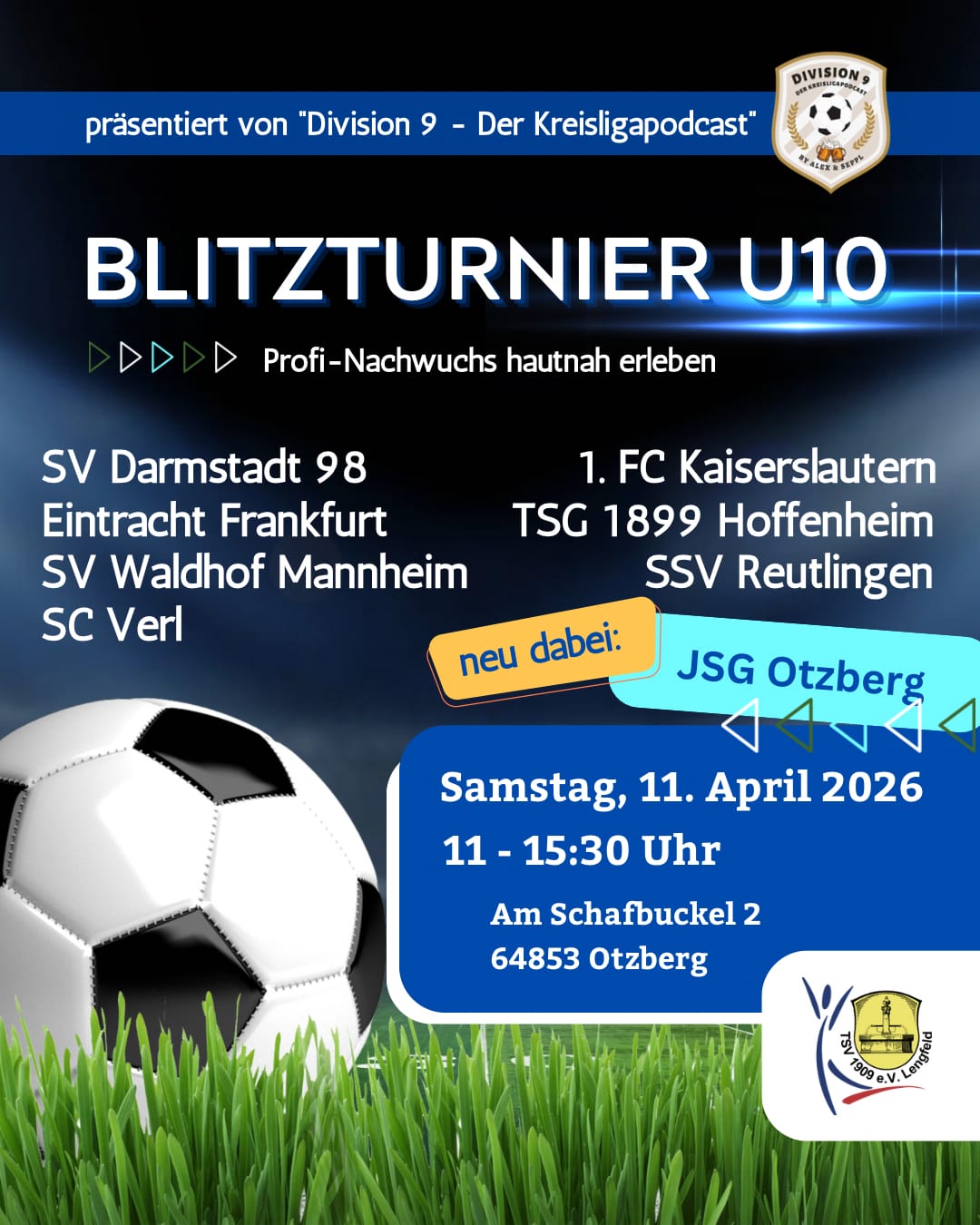 Nach der erfolgreichen Durchführung der anderen Fußball-Blitzturniere, kehren am Samstag, 11. April 2026 wieder namhafte Profi-Nachwuchs-Mannschaften auf dem Sportgelände „Am Schafbuckel“ ein. Dieses Mal darf sich auch unsere eigene E-Jugendmannschaft der JSG Otzberg präsentieren.