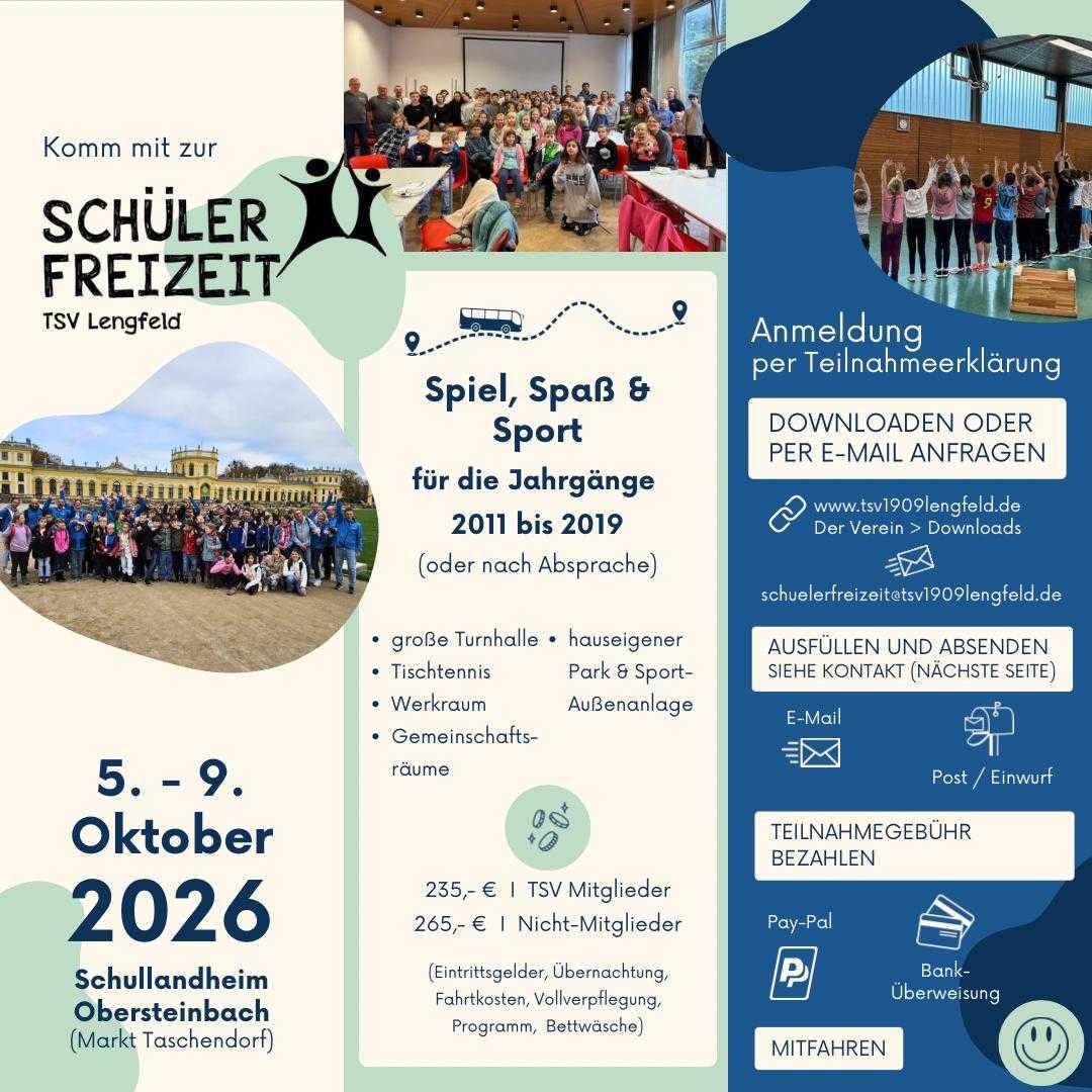 nach der gelungenen und harmonisch verlaufenen Schülerfreizeit 2025 in Külsheim, sind die Vorbereitungen für die nächste Schülerfreizeit abgeschlossen. Ziel in 2026 ist das Schullandheim Obersteinbach in der Gemeinde Markt Taschendorf, wo wir bereits im Jahr 2021 waren.
